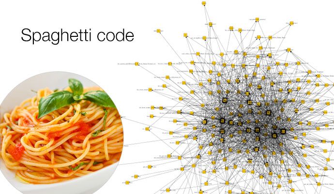 Spaghetti Code để chỉ code rối như canh hẹ, lộn, … rối như mấy cọng mì spaghetti. Đây là những dòng code móc nối nhiều module/class với nhau, flow đi vòng vèo, cực kì khó đọc và khó sửa.