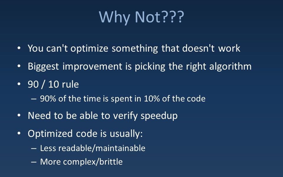 Đôi khi, việc optimize code quá sớm (chưa biết chạy chậm chỗ nào, otpimize đoạn nào) là hoàn toàn không cần thiết, nó còn làm code phức tạp hơn, khó đọc, khó debug hơn.